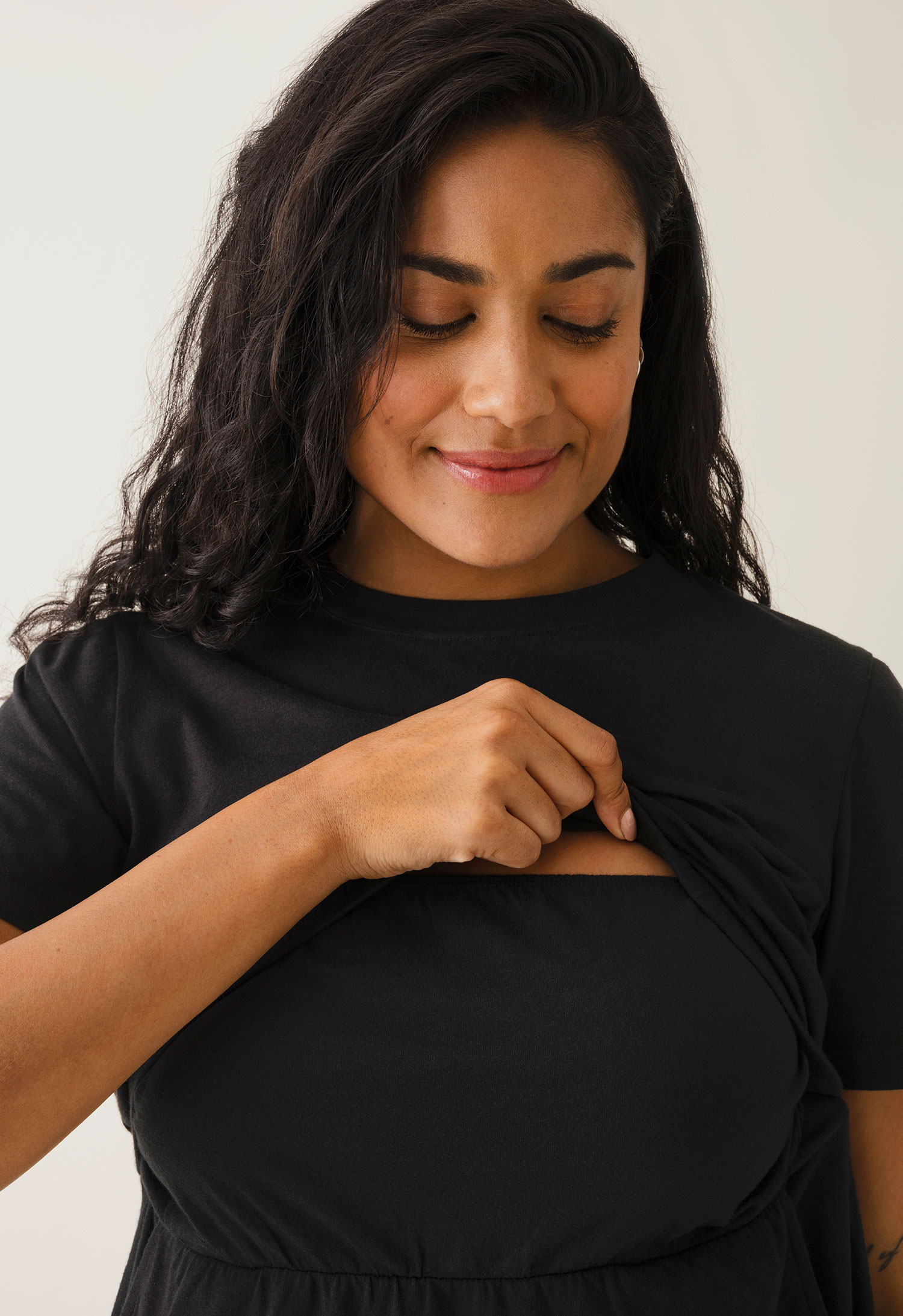 Möt din nyago-to klänning – lika bekväm som en t-shirt, men med det lilla extra! The-Shirt Mini Dress är en mjuk och följsam klänning med en smidig amningsfunktion under bysten, vilket gör det enke